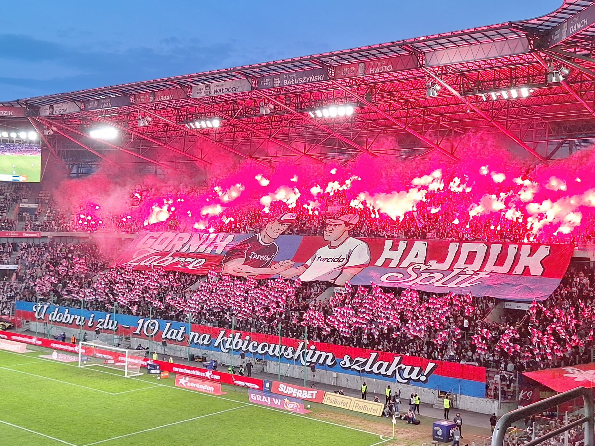 Poza tym sporo działo się na Torcidzie, gdzie sympatycy Górnika świętowali 10. rocznicę zgody kibicowskiej z Hajdukiem Split. Poświadczał to znajdujący się w dolnej części oprawy zgodowej napis: „U dobru i zlu – 10 lat na kibicowskim szlaku!”. Całość dopełniały oczywiście race. Warto wspomnieć, że rok temu baner o podobnej treści w języku polskim wywiesili w Splicie kibice miejscowego Hajduka podczas meczu z HNK Rijeka. Jego treść brzmiała następująco: „Za nami 9 wspólnych lat. Już zawsze Górnik to Hajduka brat! Torcida Górnik!”.