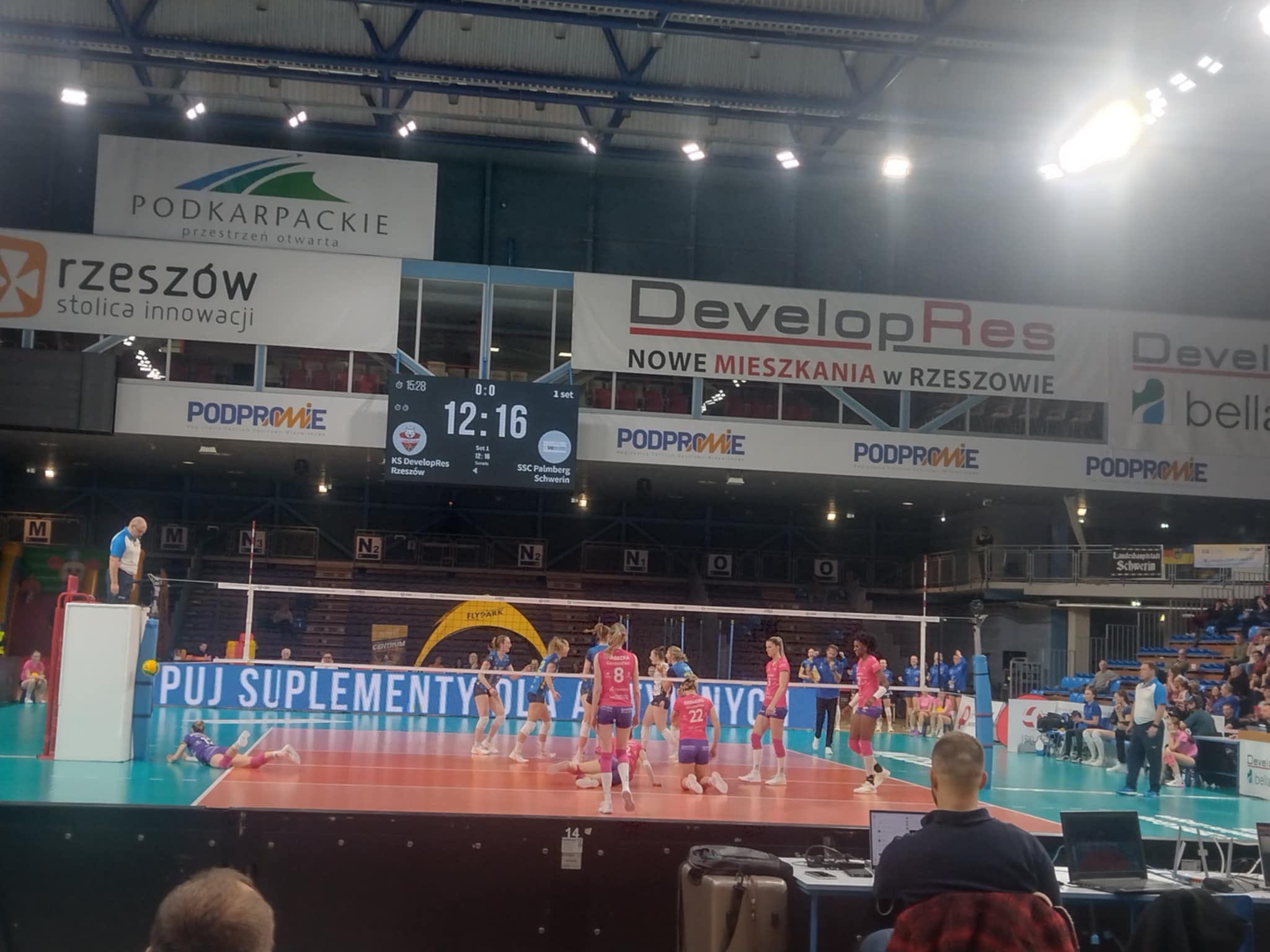 Cztery dni później rzeszowskie siatkarki rywalizowały z Palmbergiem Schwerin. Było to spotkanie ostatniej kolejki fazy grupowej Ligi Mistrzyń. Jego wynik decydował o tym, kto wygra grupę E. Na początku stycznia Rysice wygrały na wyjeździe z niemieckim rywalem po pięciosetowym boju.